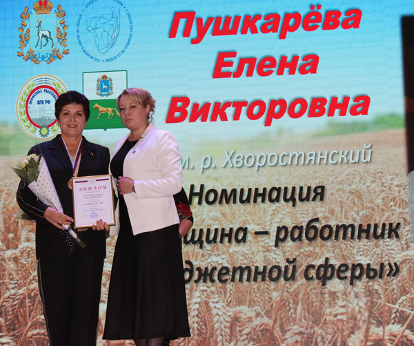 По инициативе региональной общественной организации «Союз женщин Самарской области» и при поддержке федерации профсоюзов, министерства сельского хозяйства и продовольствия, профсоюза работников агропромышленного комплекса в регионе состоялся конкурс «Хозяйка села-2025». На сцене Дома культуры поселка Серноводск Сергиевского района 24 октября состоялось чествование 31 победительницы из 21 муниципального образования. В номинации «Женщина - работник бюджетной сферы» была награждала и наша землячка – Е.В. Пушкарева.